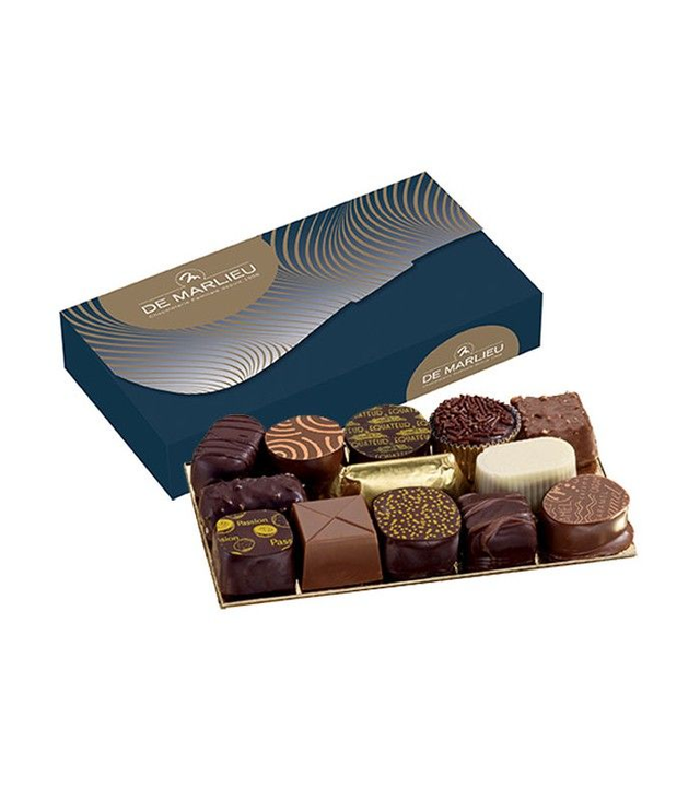 Producteur : Chocolaterie de Marlieu - Assortiment de 13 chocolats rangés, 12 variétés. Carré praliné lait/noir, Dauphin lait/noir, Pralinés Éclats, Fourré ganache, Ovale blanc, Ganache caramel, Ganache Lait, Gianduja, Grands crus, Ganache Passion, Pâte d'amande, Nougatine, Perle noire - Allergène : FRUITS à COQUES